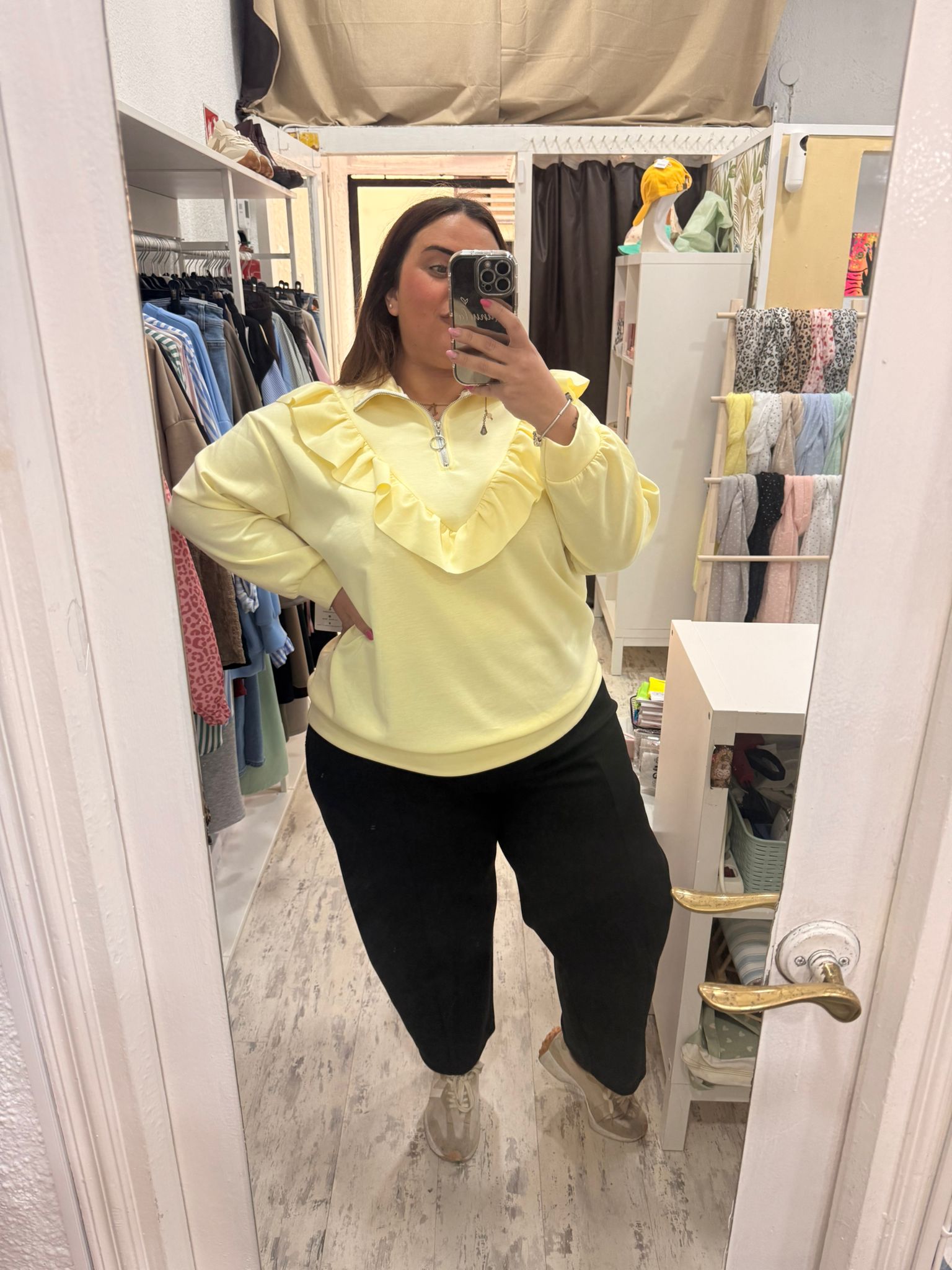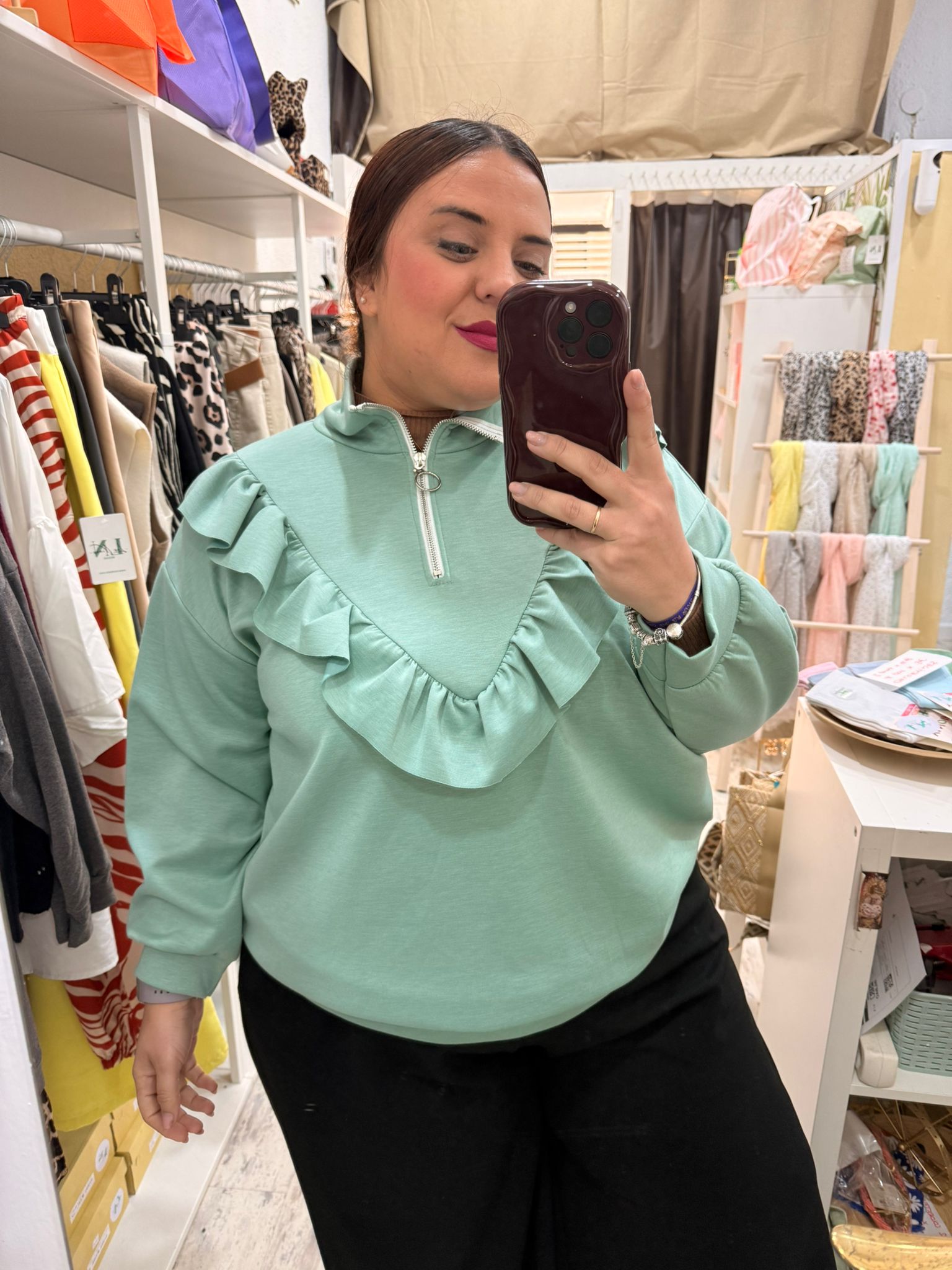 Sudadera con volante en el escote, cuello estilo polito y cremallera.