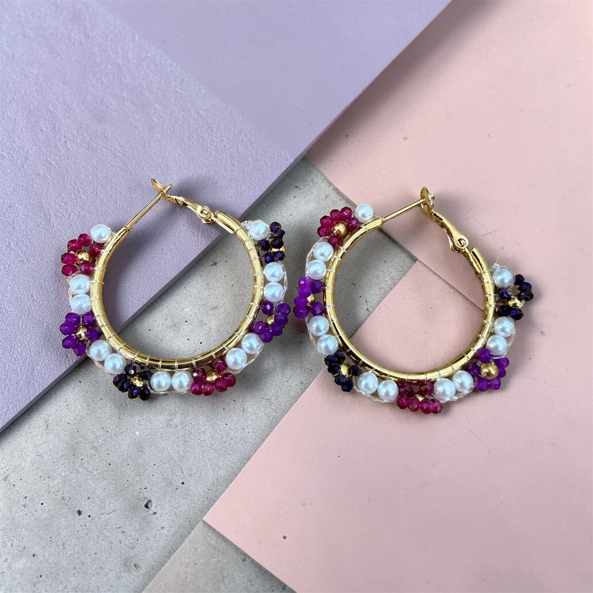 Argollas de acero en color dorado con bolitas que forman flores en tonos malva, rosa, negro y blanco.