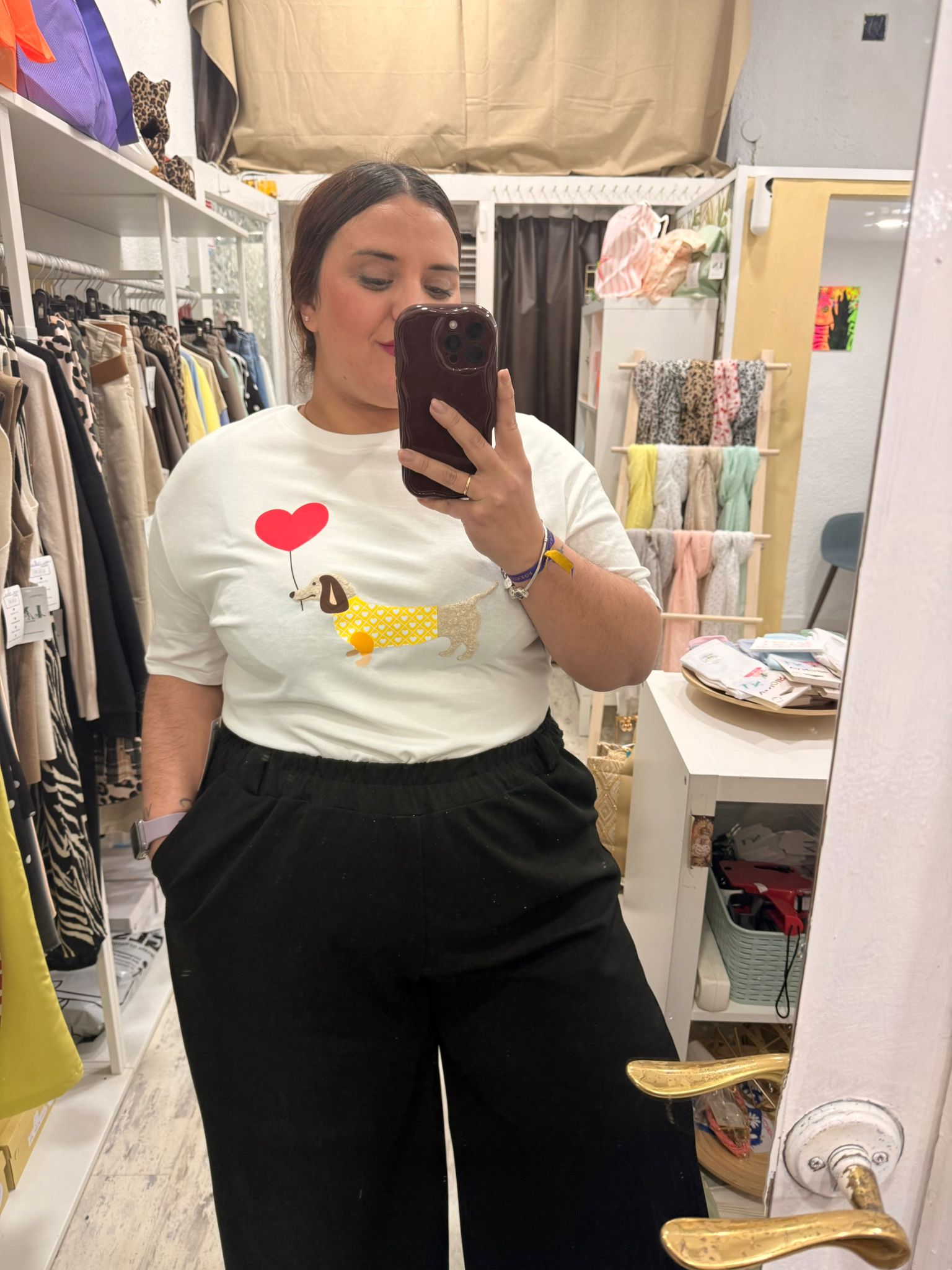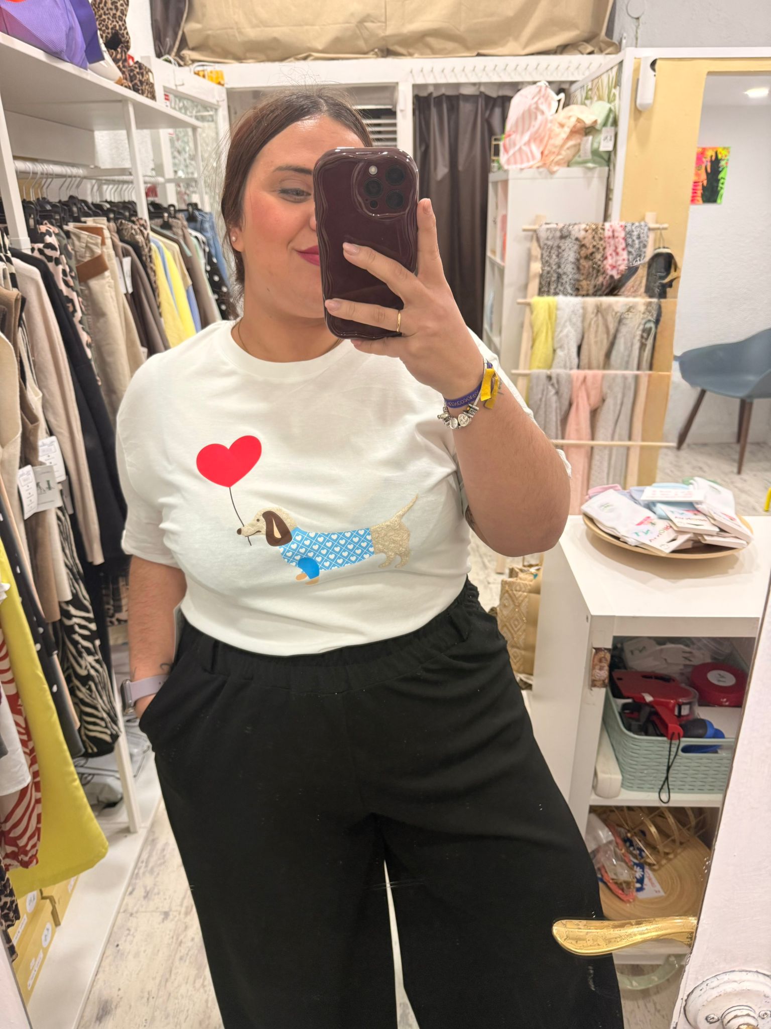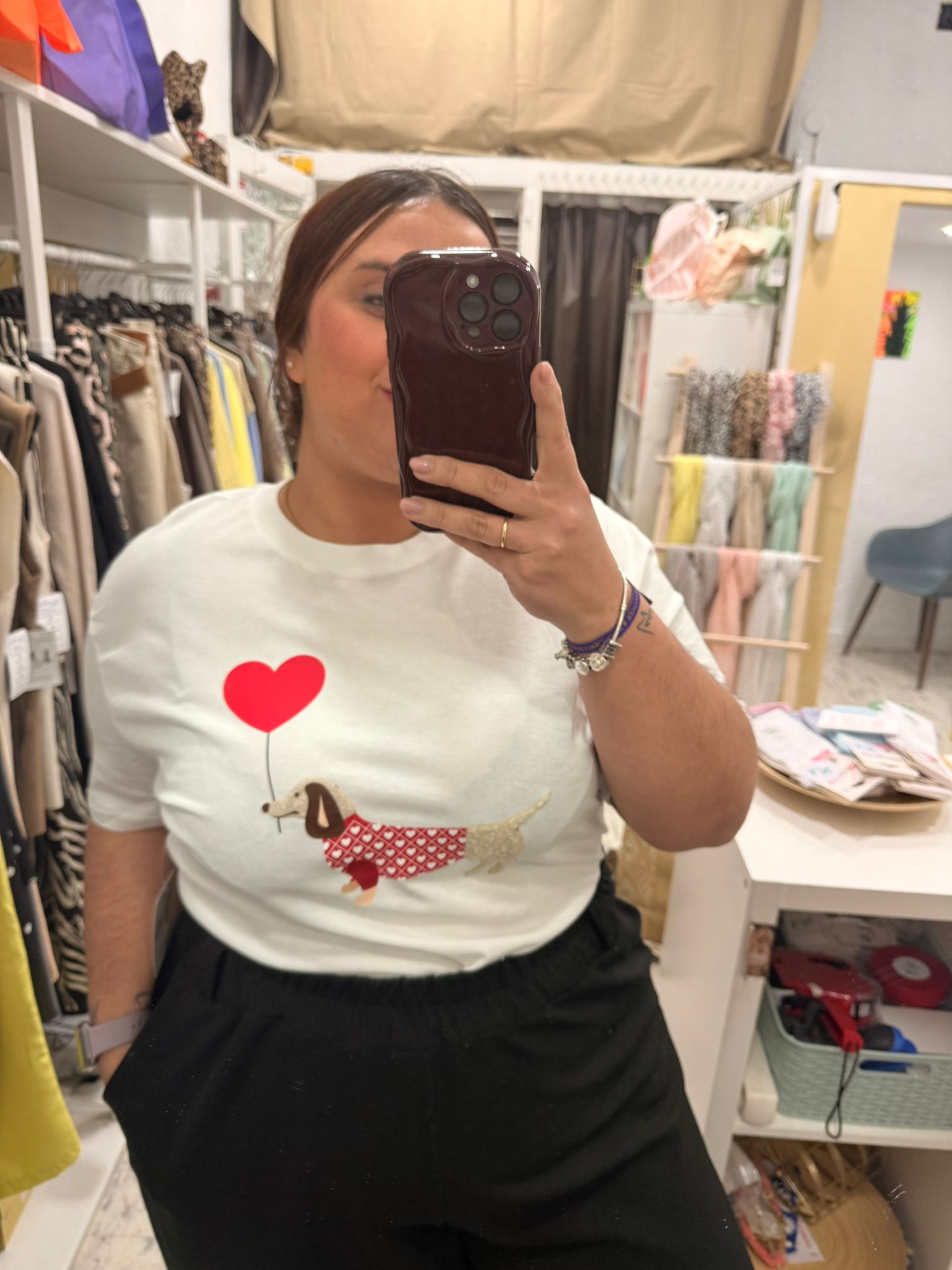 Camiseta de algodón en color blanco con perro salchicha en el centro, el cuerpo del perro es relieve y varían los colores del jersey.