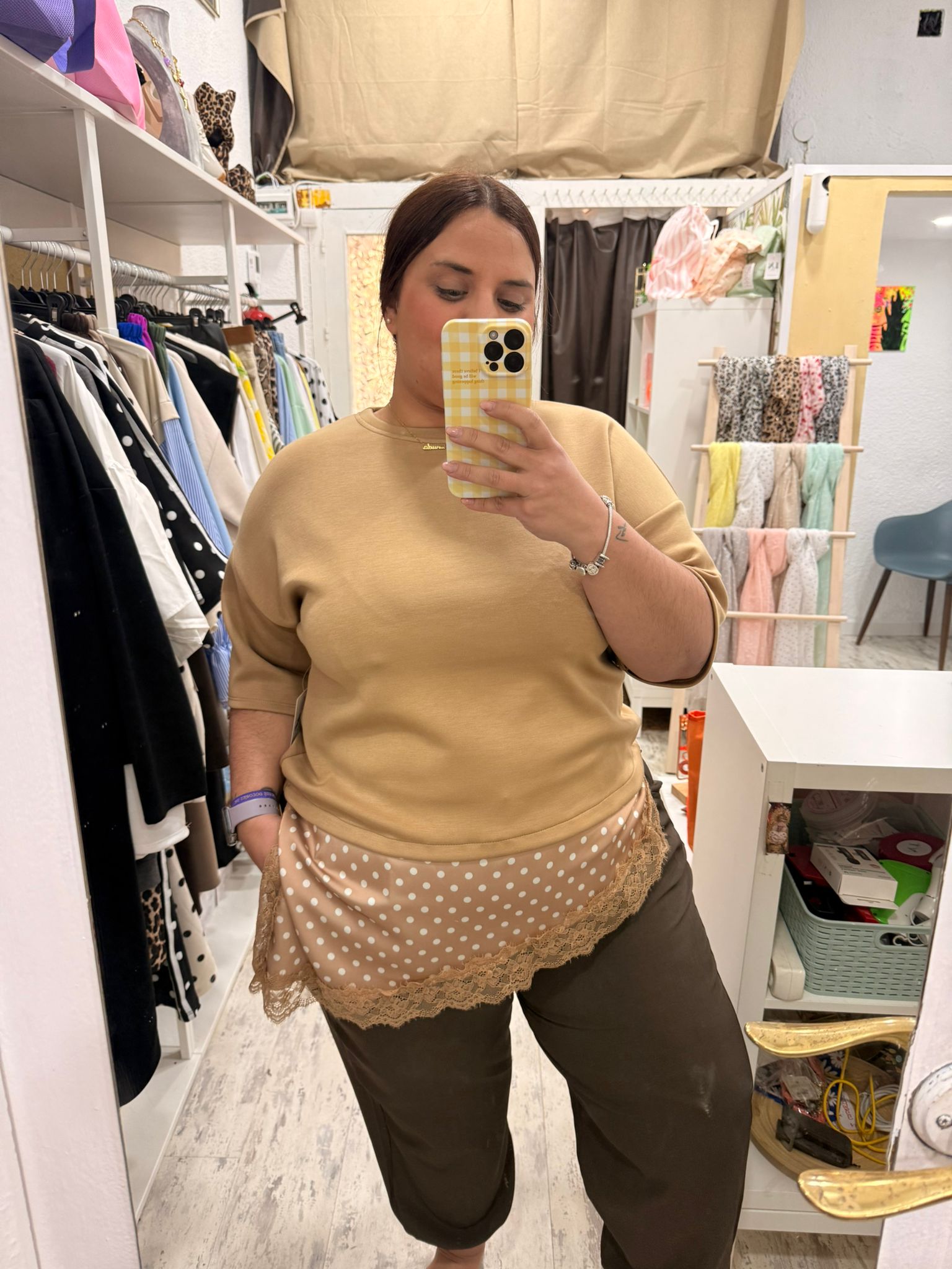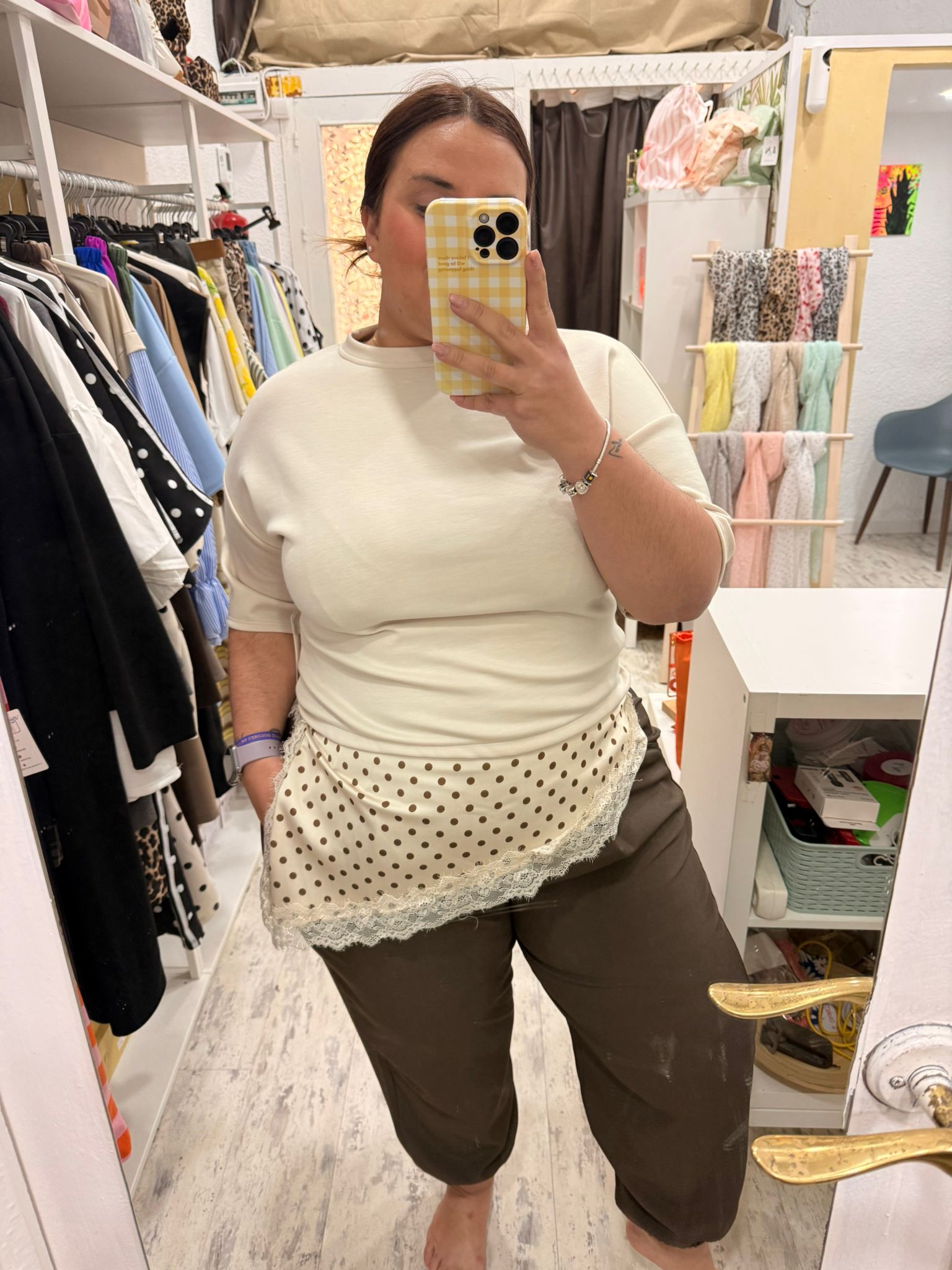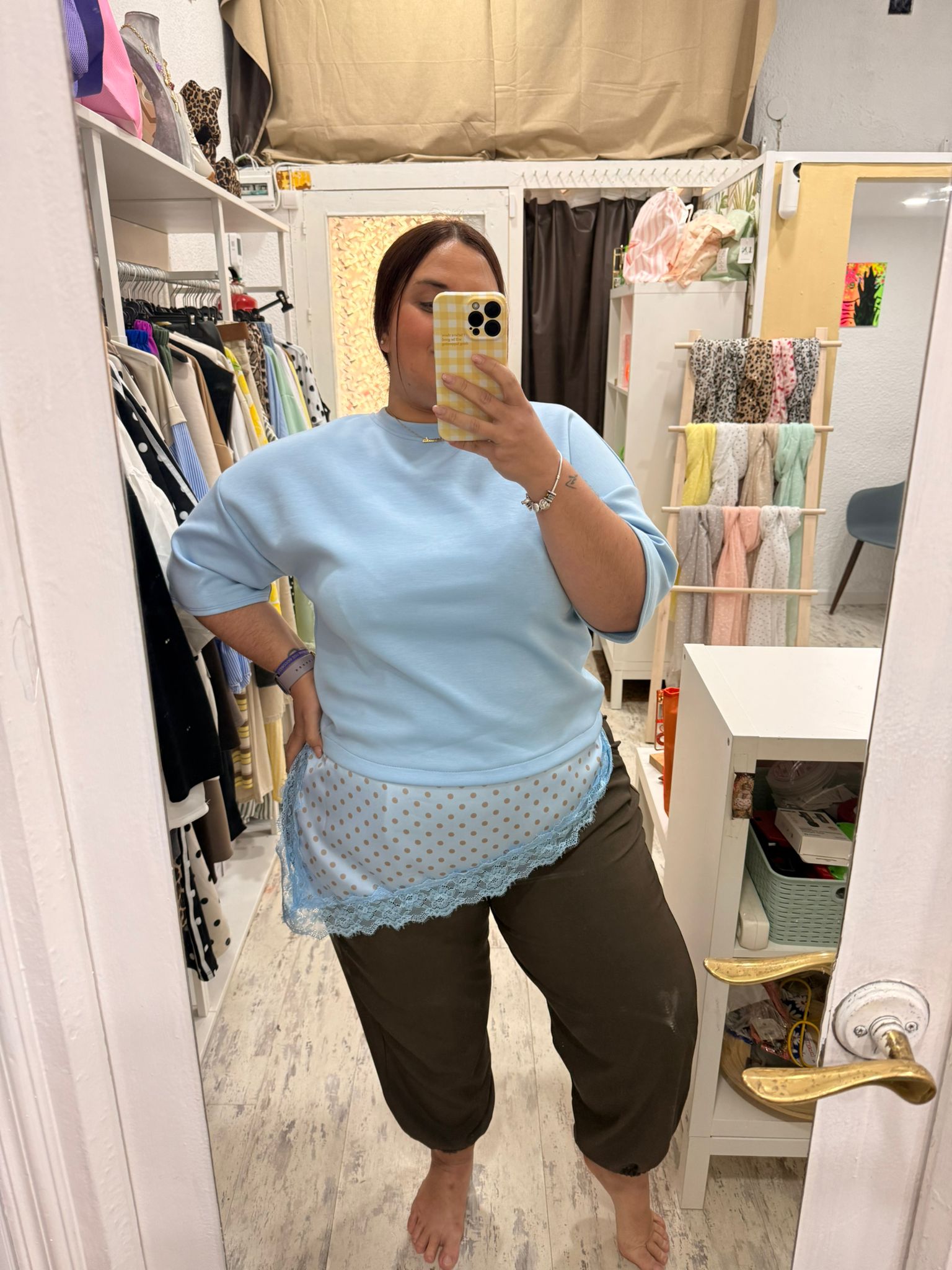 Camiseta básica de tejido de capa de aire con el bajo satinado estampado con lunares y encaje. Asimétrica.