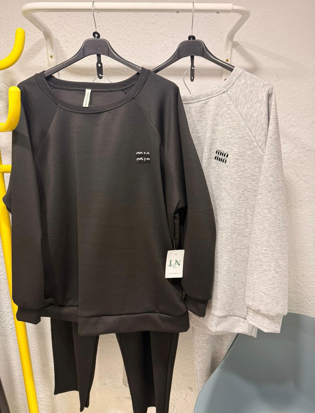 Chándal de capa de aire, formado por dos piezas: pantalón y sudadera. La sudadera tiene un detalle de brillo en la parte izquierda superior y el pantalón igual. El pantalón tiene bolsillos, cinta para ajustar la cintura y es de pata recta.