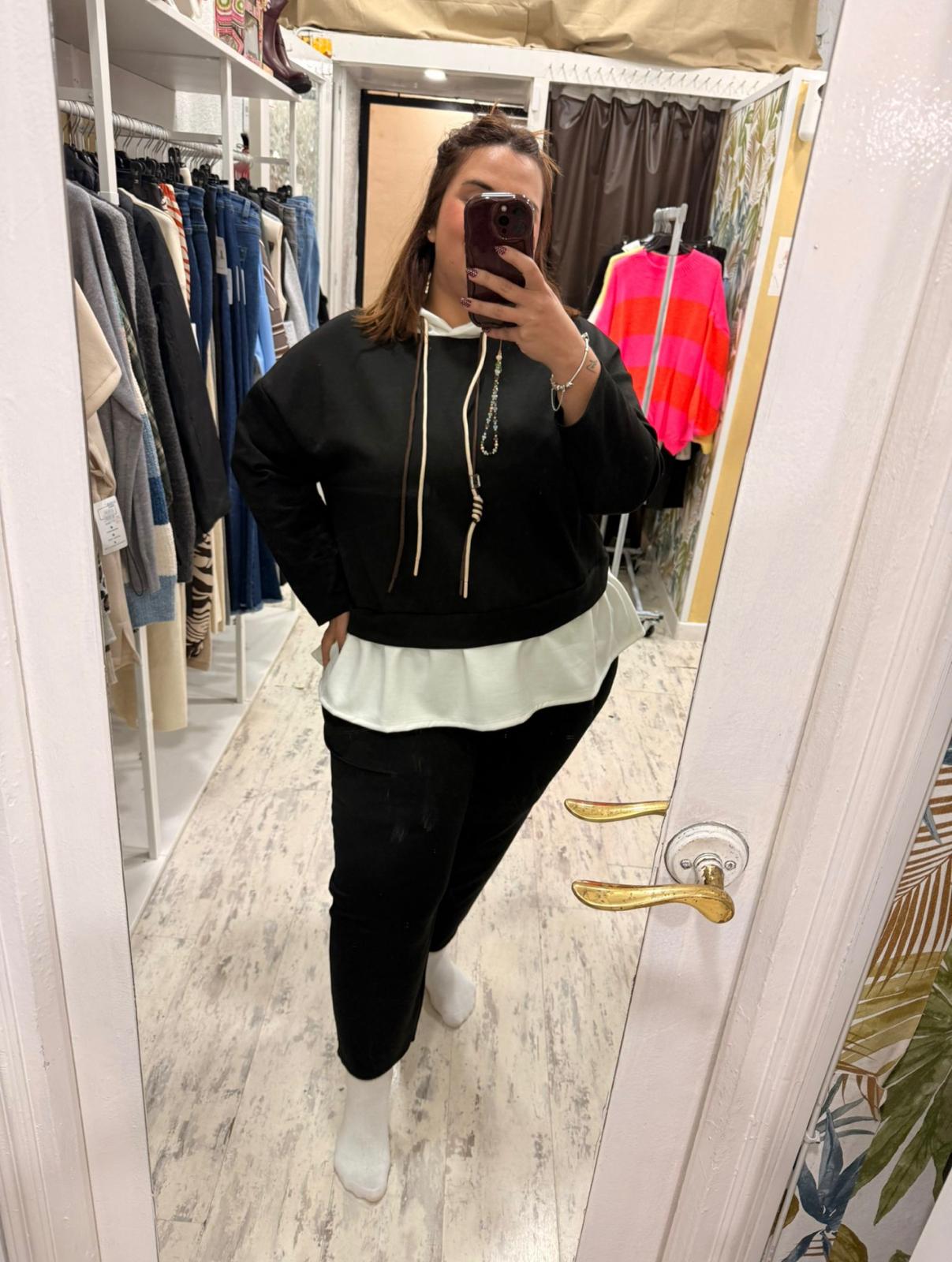 La sudadera trae incorporada en el bajo una camisa y capucha. El pantalón tiene bolsillos, cordón para ajustarlo y es pitillo.