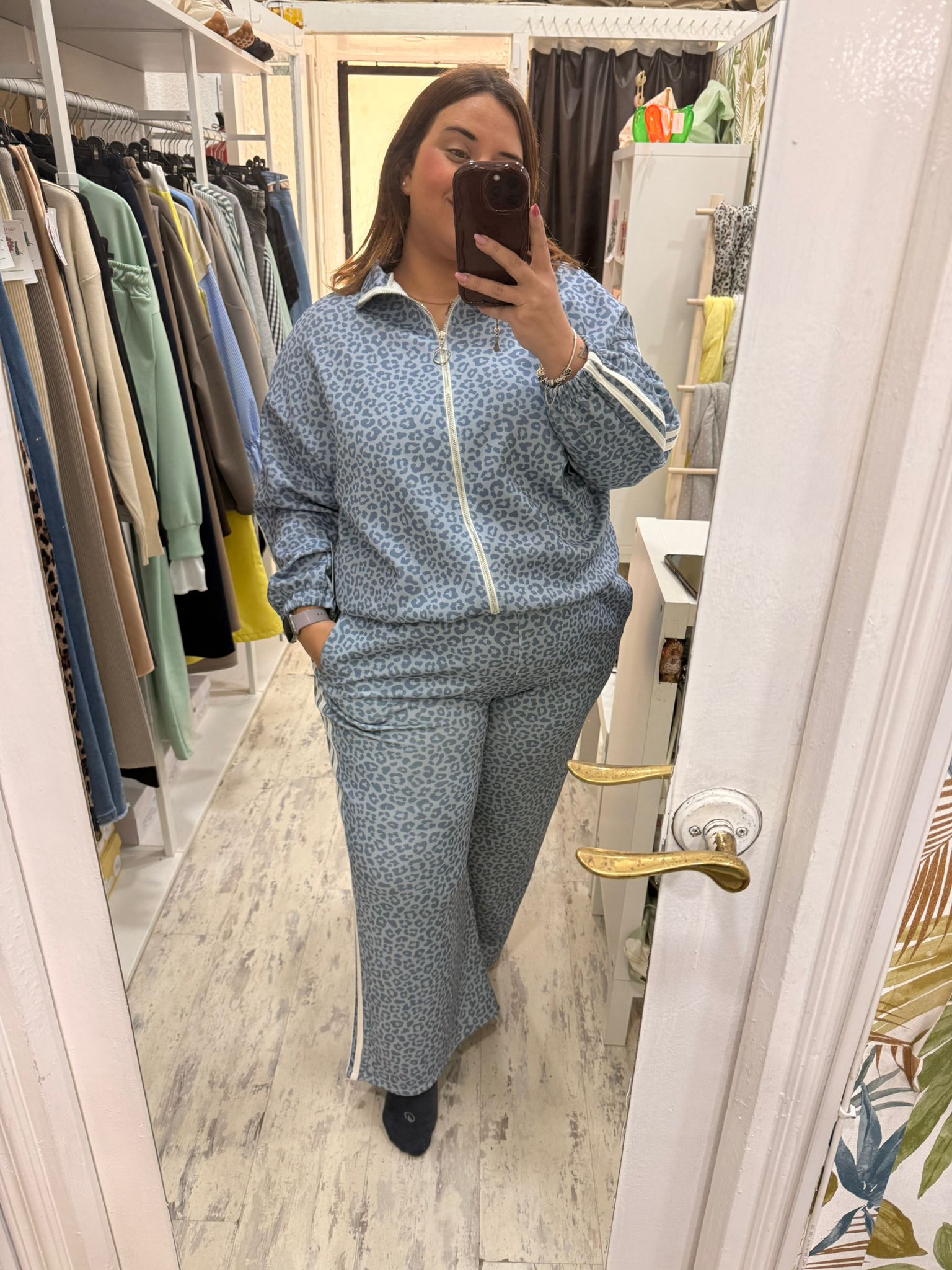 La sudadera tiene cremallera en el pecho, es estilo oversize y tiene goma en la bajo (estilo bomber), el pantalón es acampanado con cintura de elástico.