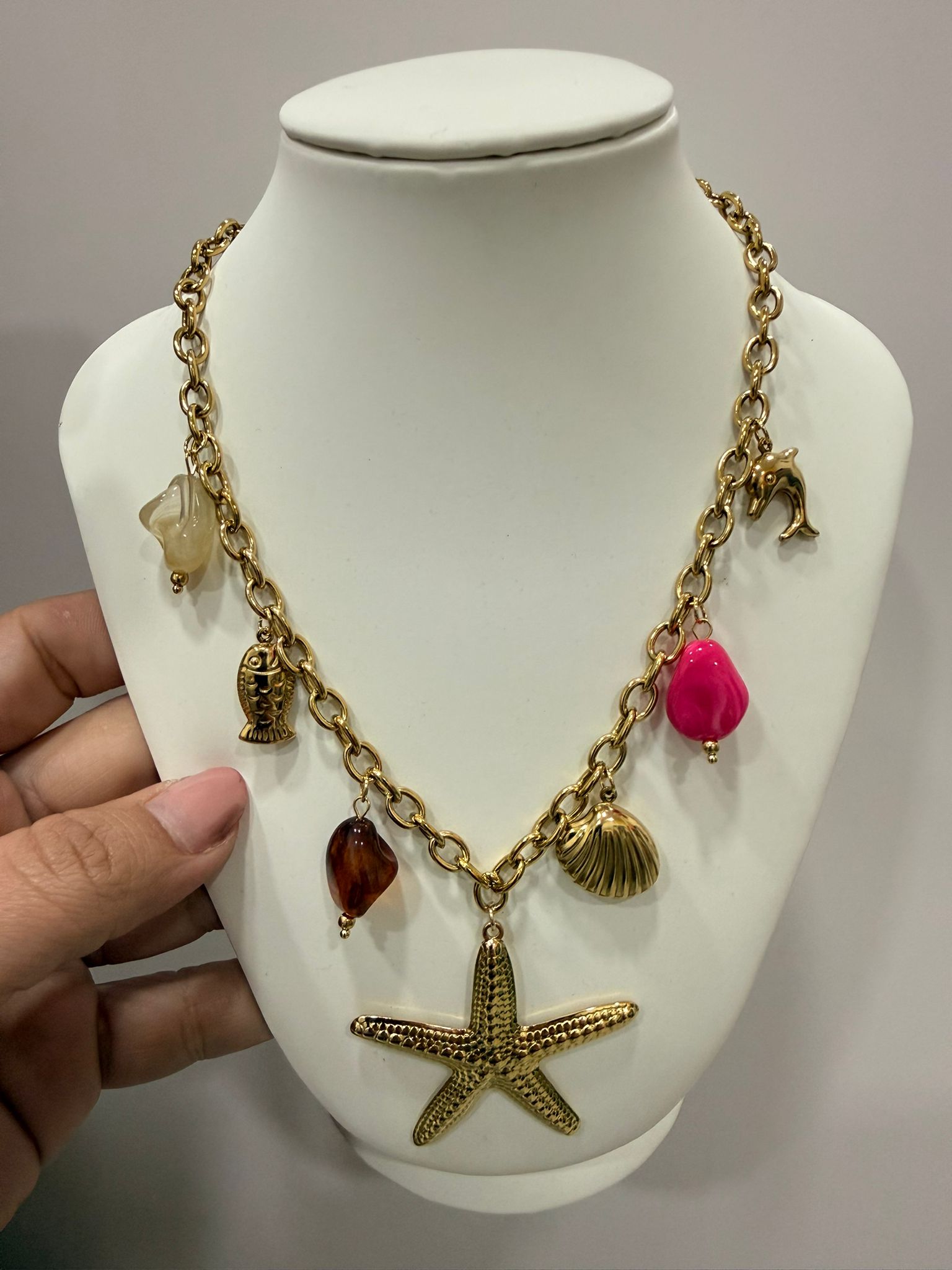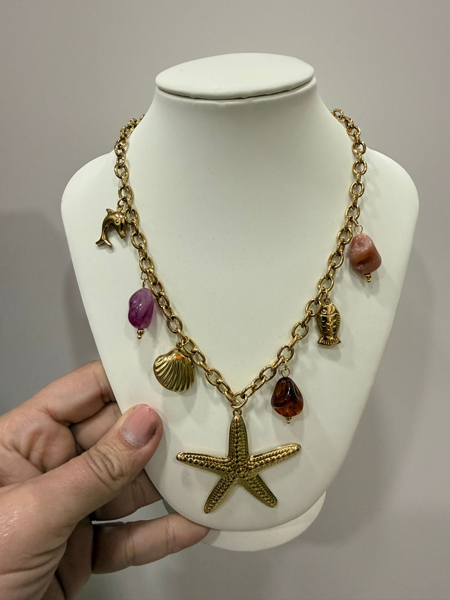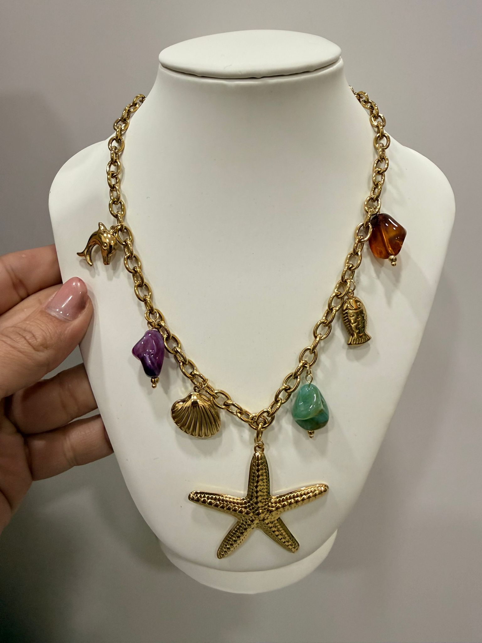 Collar de acero con estrella de mar en el centro y detalles de concha y peces con piedras de colores.