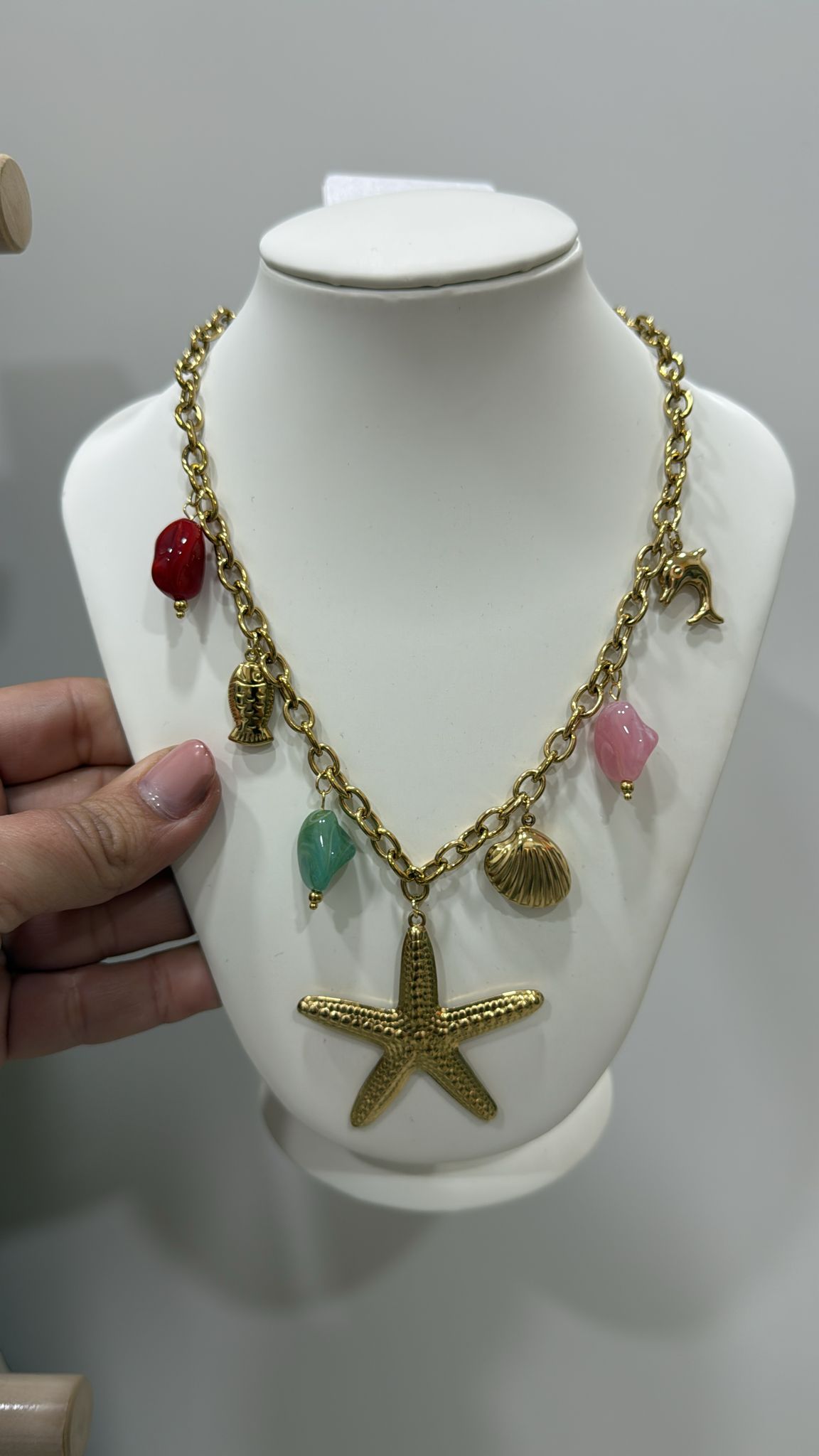 Collar de acero con estrella de mar en el centro y detalles de concha y peces con piedras de colores.