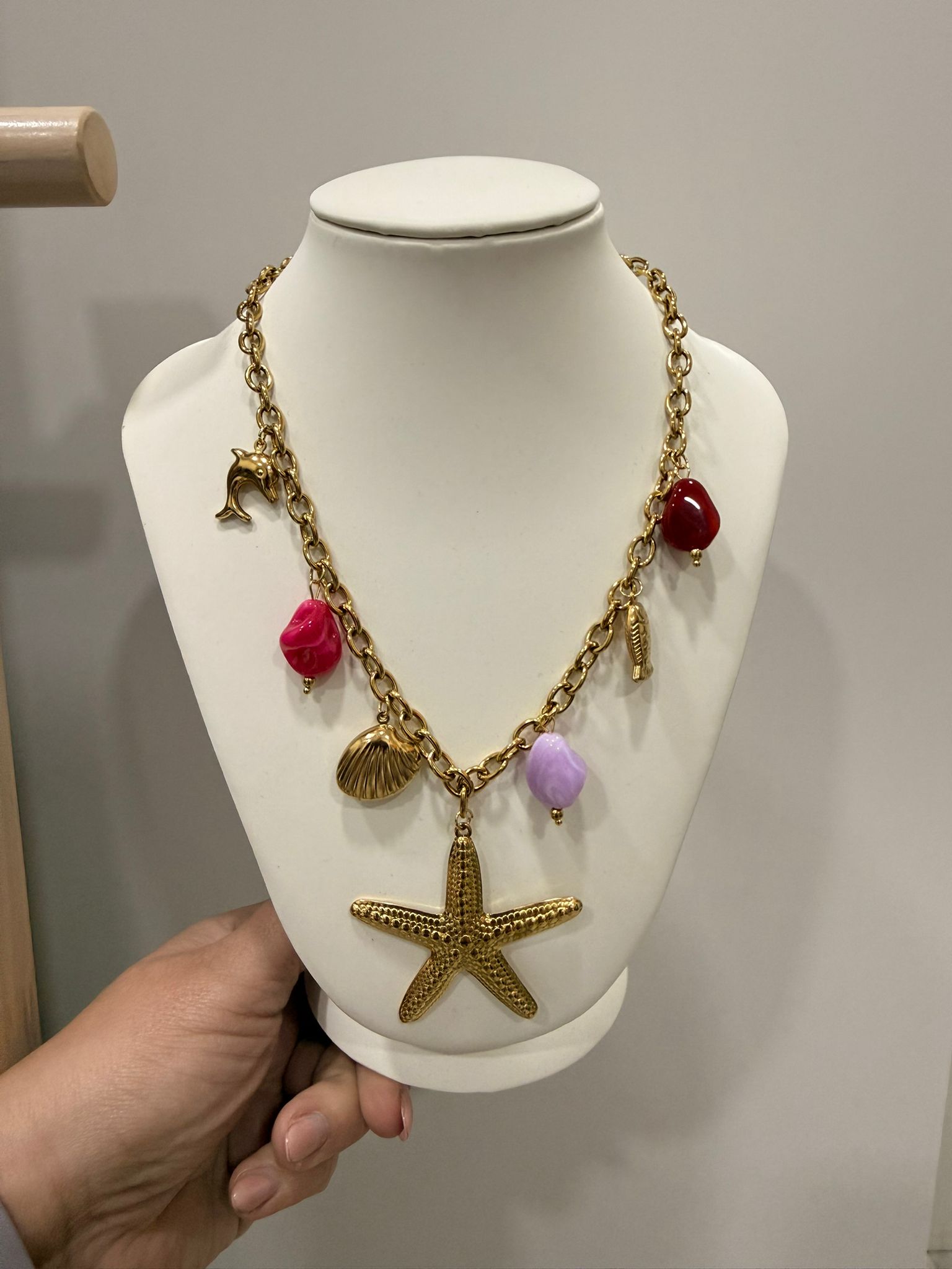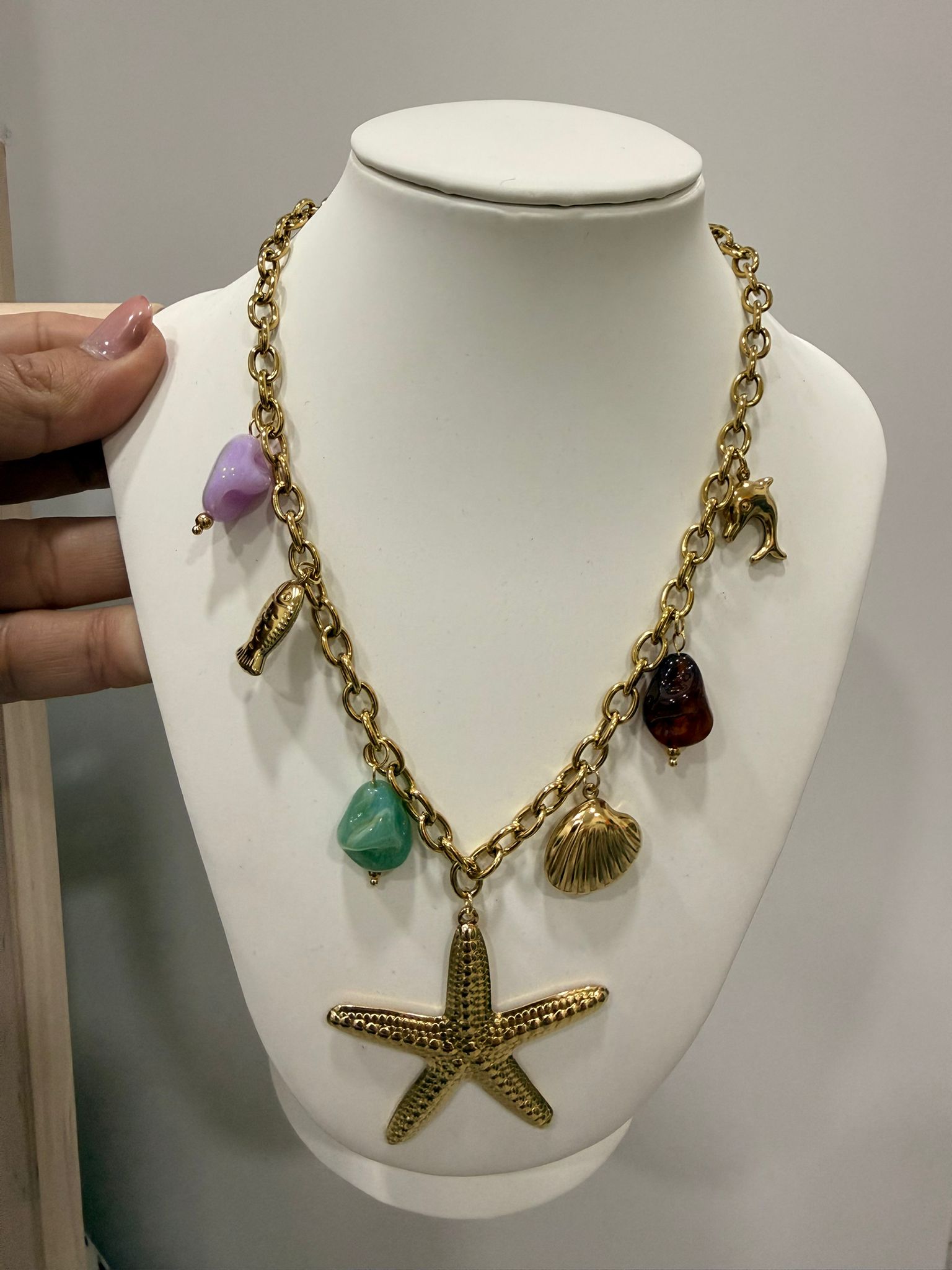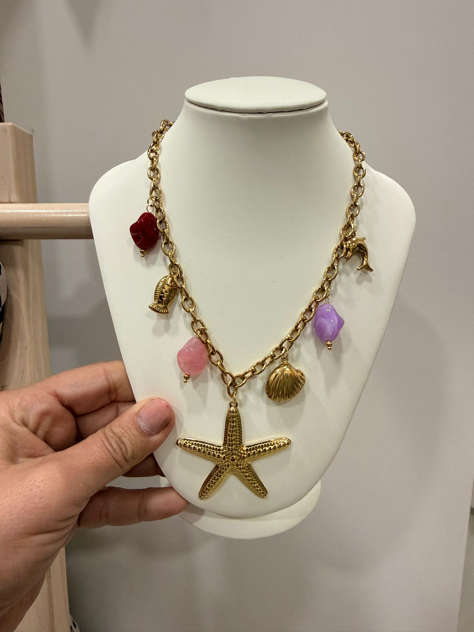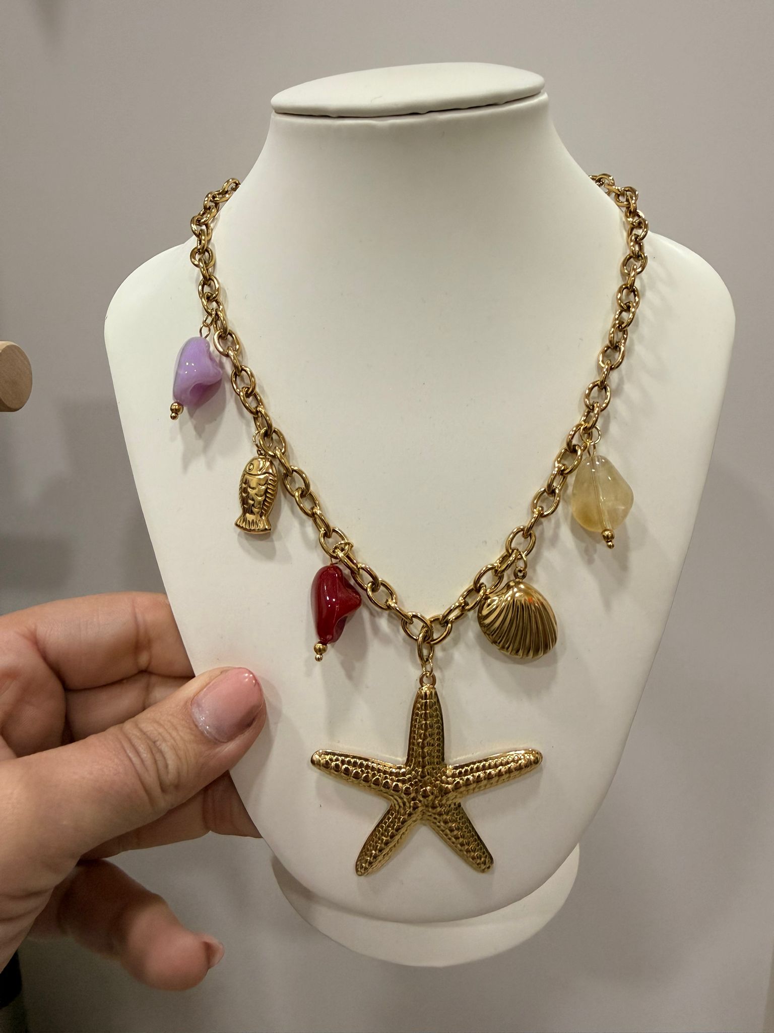 Collar de acero con estrella de mar en el centro y detalles de concha y peces con piedras de colores.