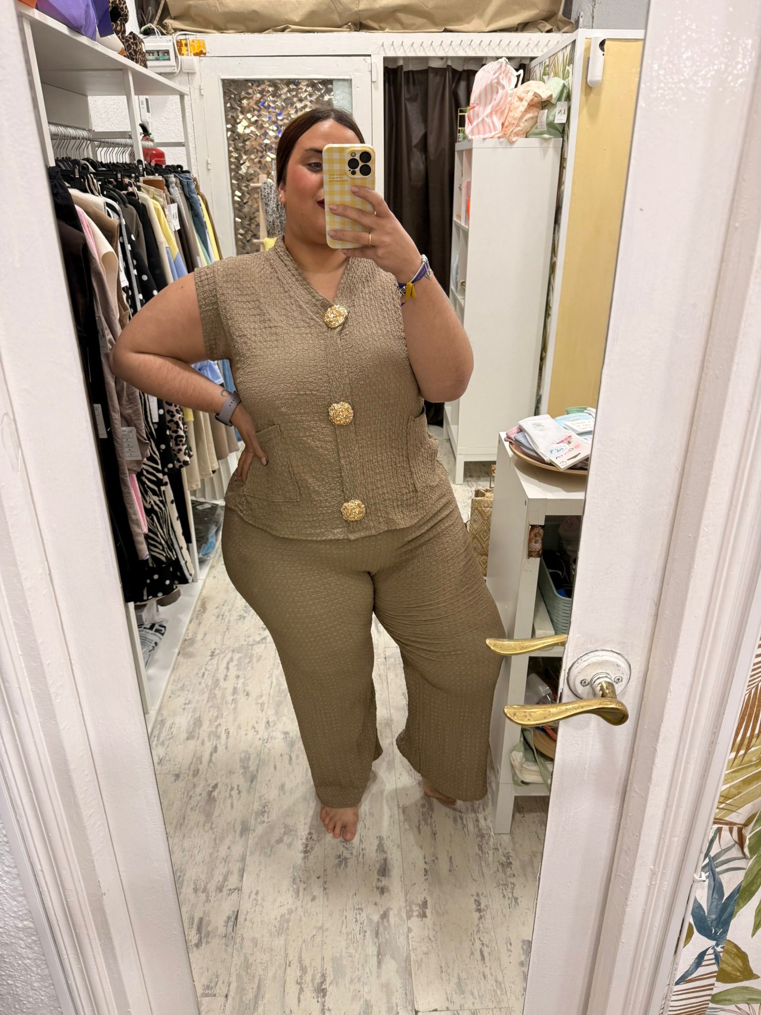 Conjunto formado por chaleco con decoraciones doradas y pantalón recto. El chaleco no se abre porque viene cosido.