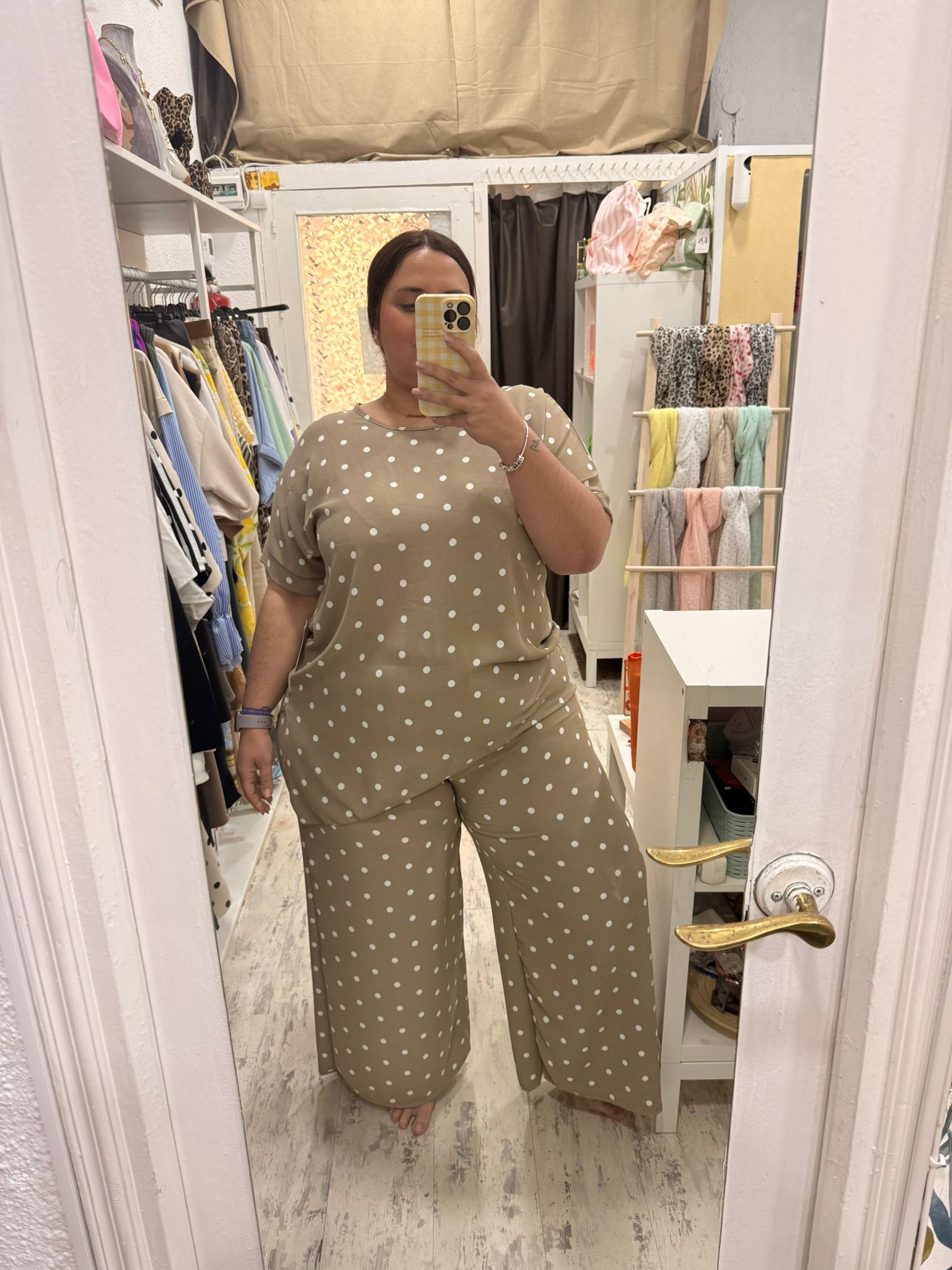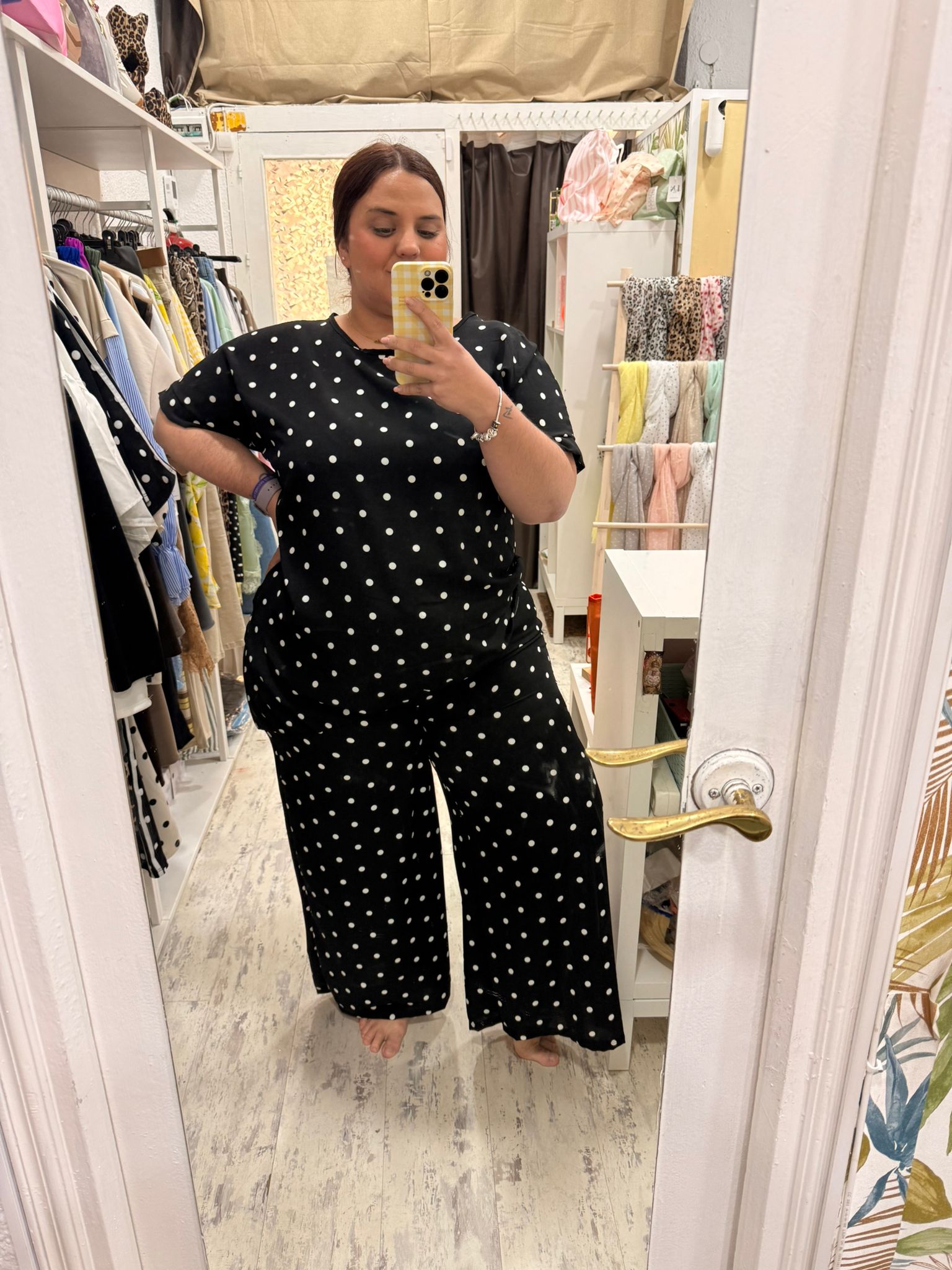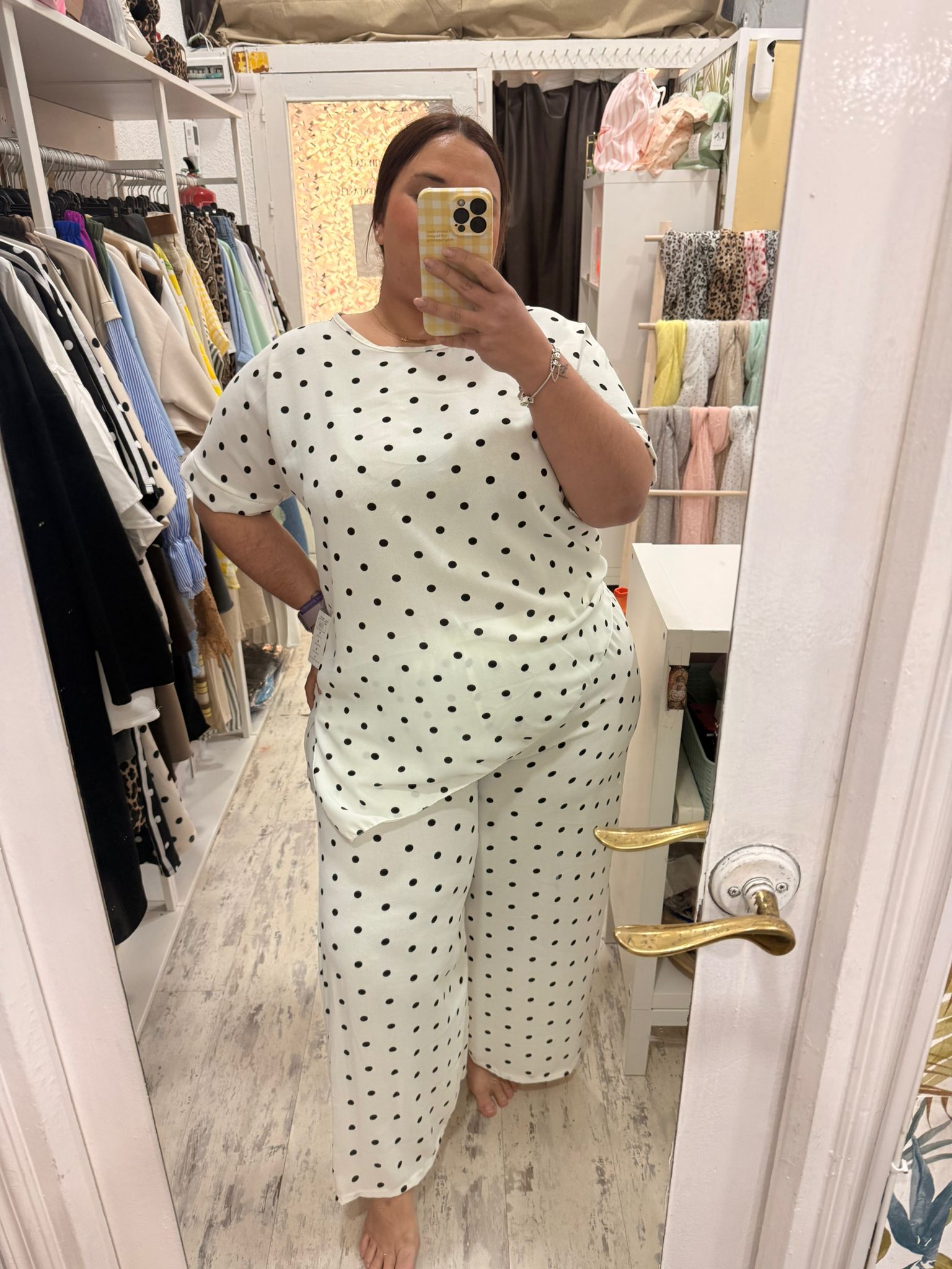 Conjunto de dos piezas con estampado de lunares formado por camiseta y pantalón. La camiseta es asimétrica y el pantalón lleca cintura de elástico y pata ancha.