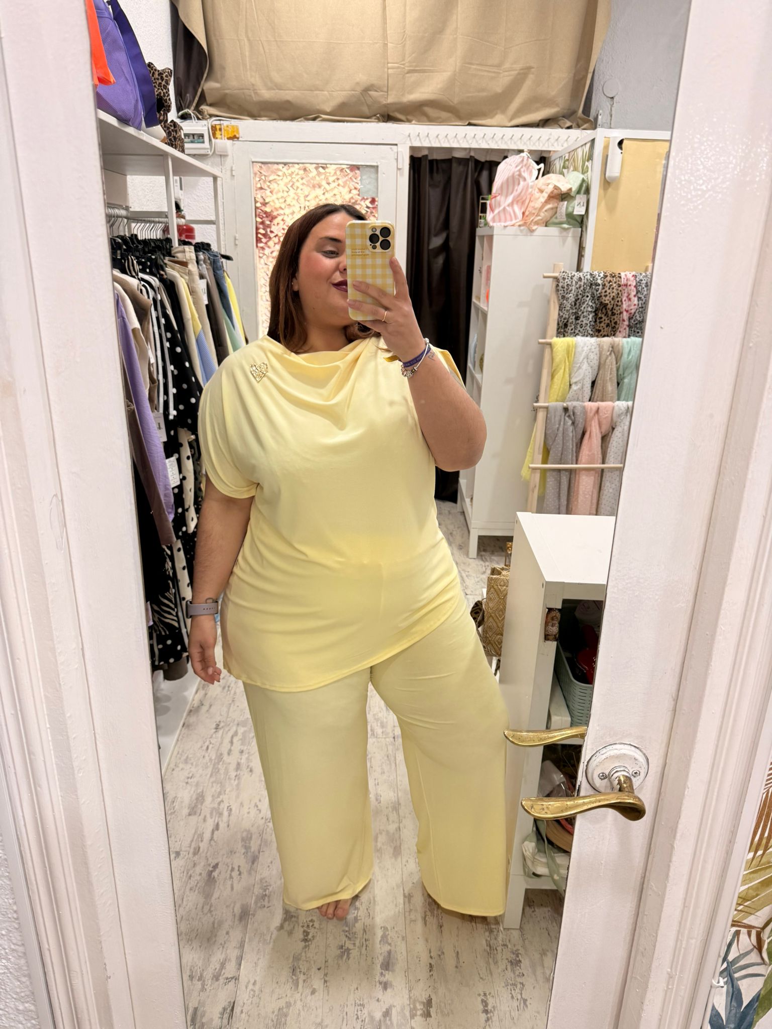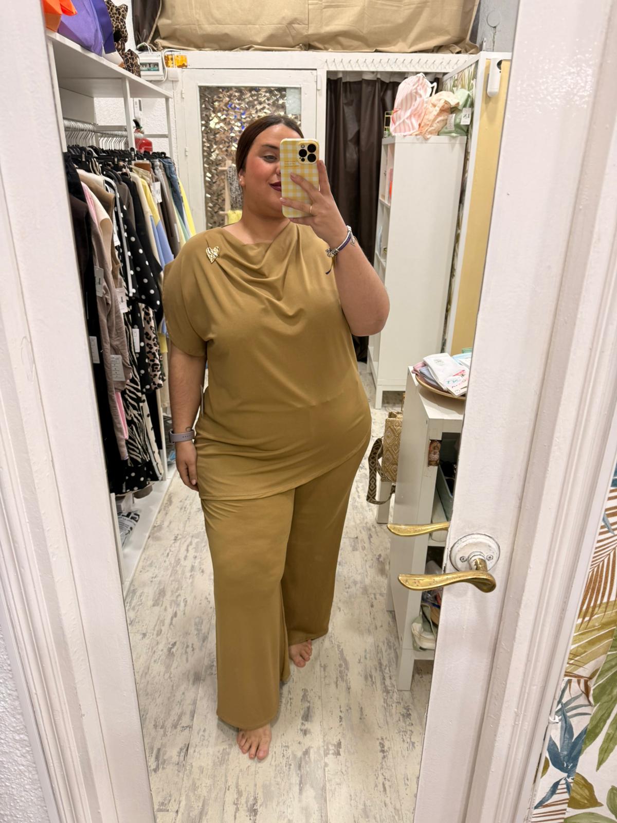 Conjunto de dos piezas de licra fría. Pantalón con cintura elástica y acampanado. Camiseta asimétrica, con cuello drapeado y mangas sueltas.