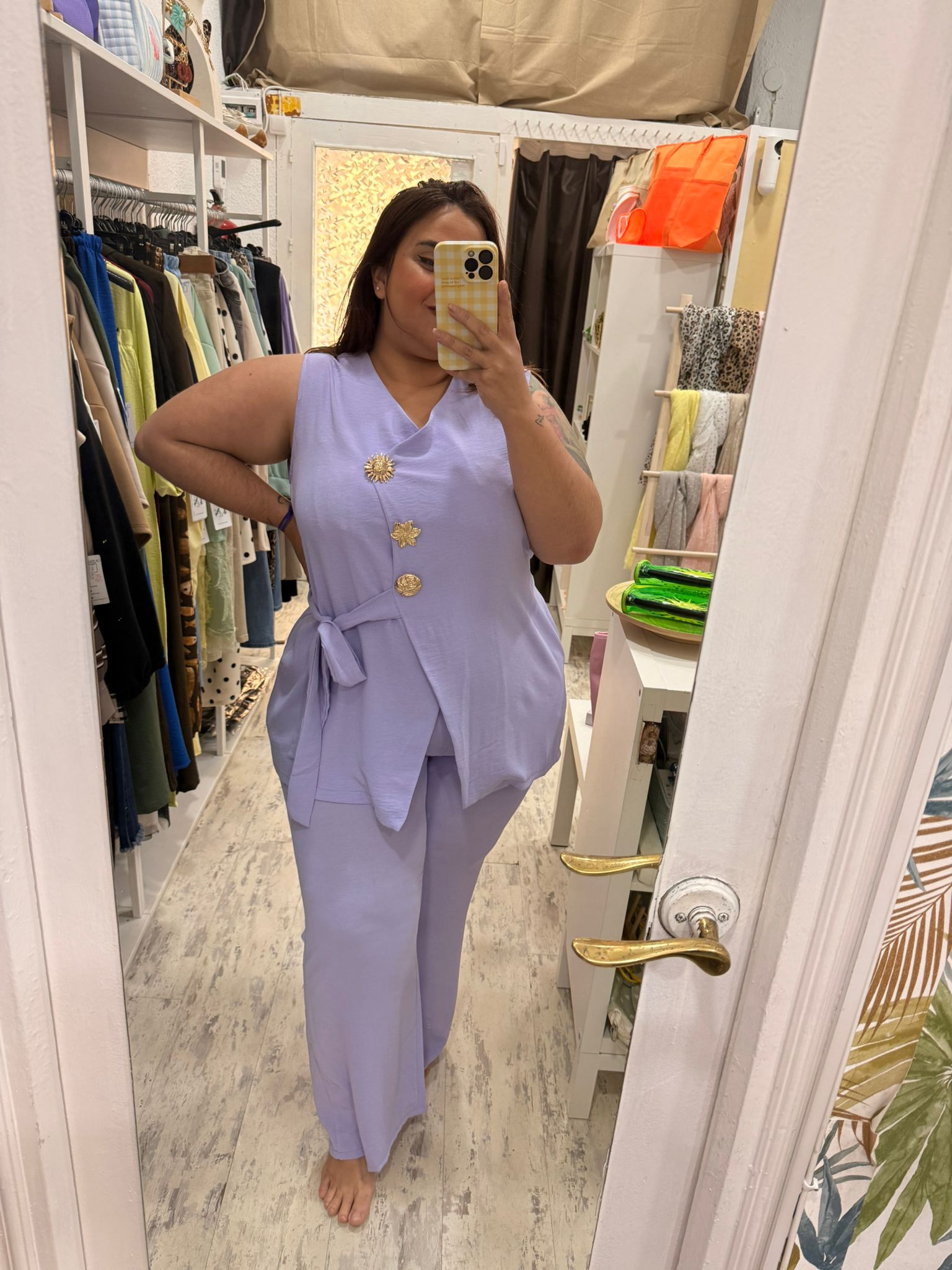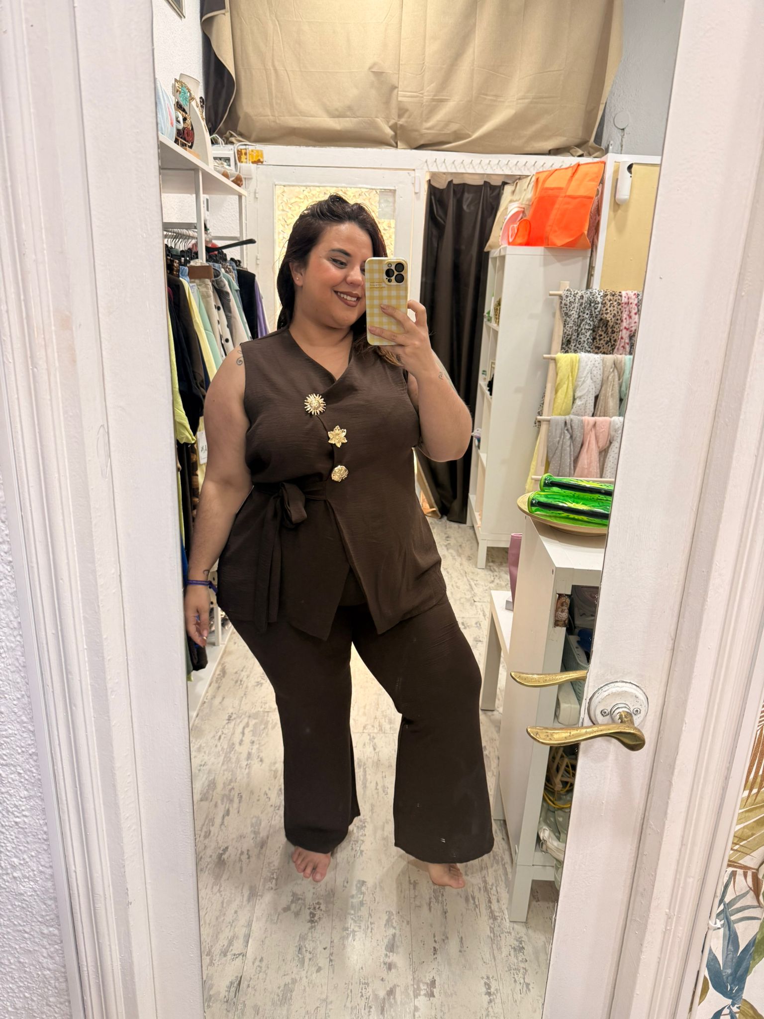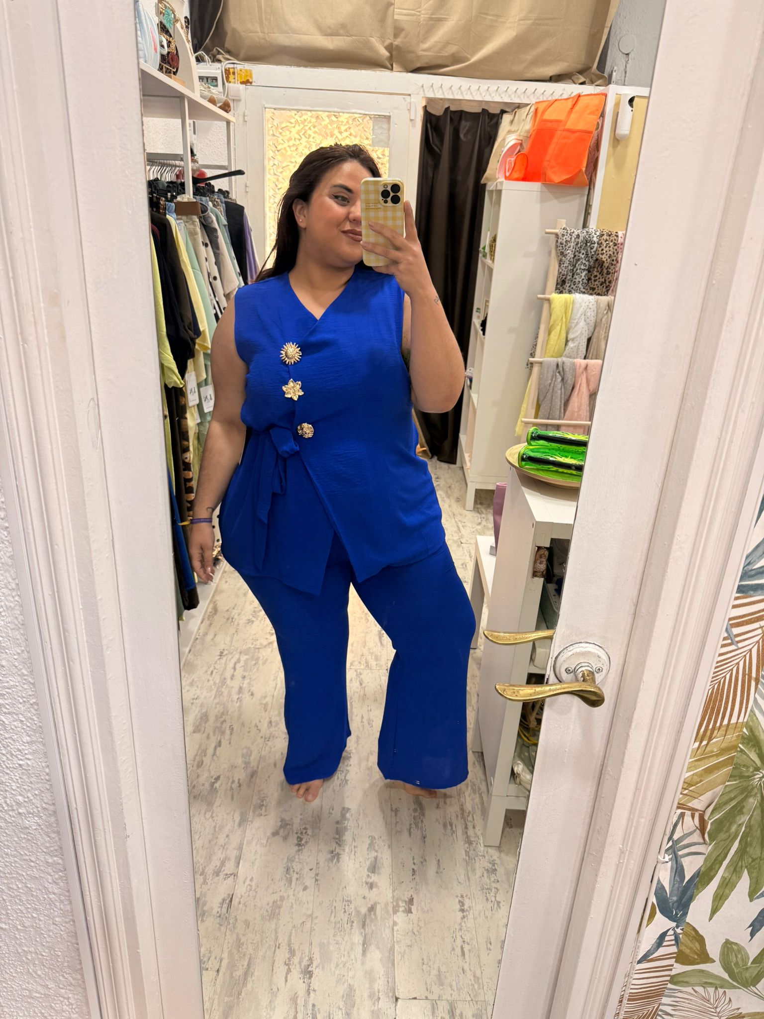 Conjunto de dos piezas: pantalón y chaleco. Chaleco con escote en V y broches dorados que pueden quitarse si lo deseas. Pantalón de acampanado, con cinturilla de elástico y bolsillos.
