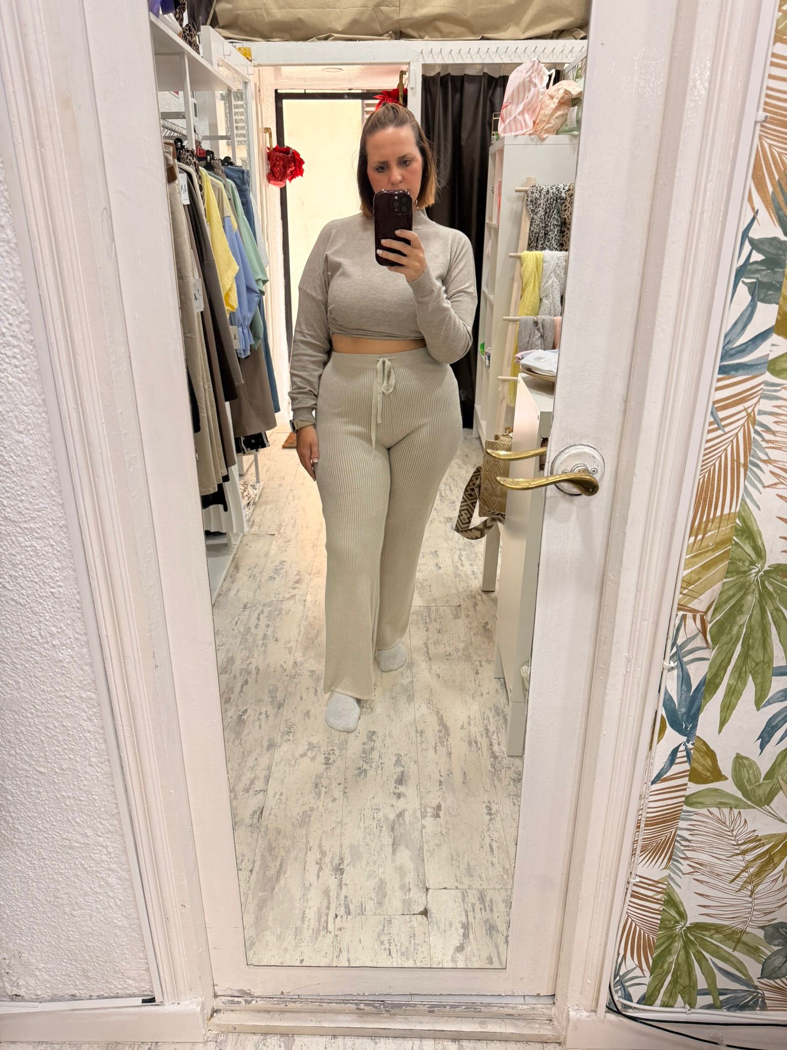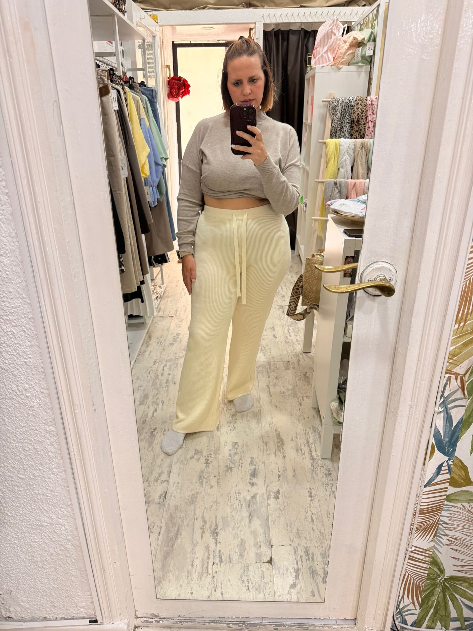 Pantalón de punto de pata recta con cinturilla elástica y cordón ajustable.