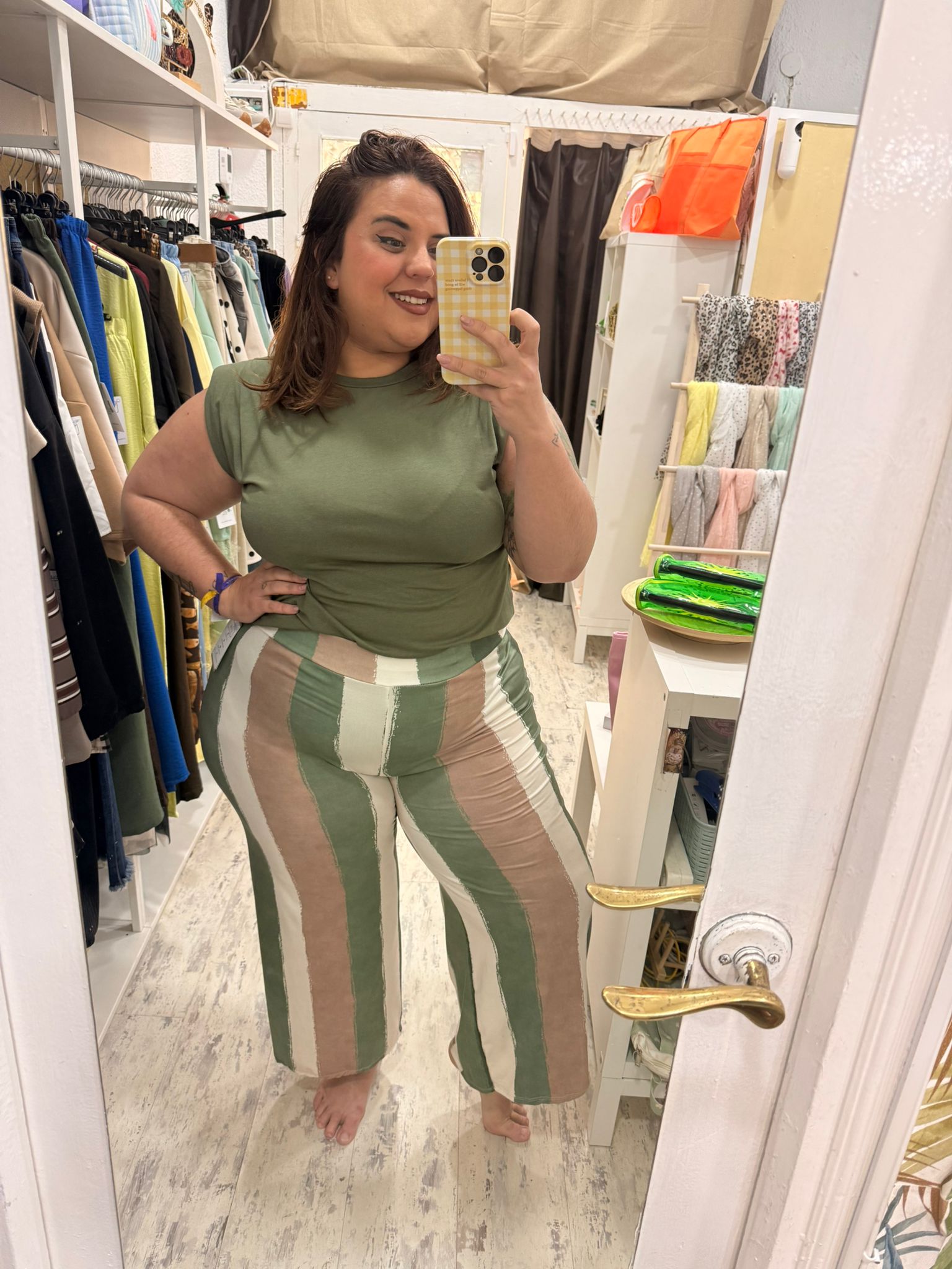 Pantalón de lycra con cinturilla de elástico, pata ancha y estampado de rayas verticales.