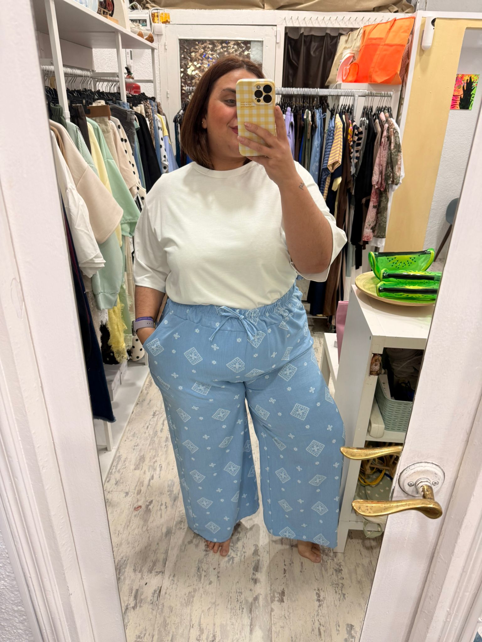 Pantalón que simula tejido vaquero, pata ancha, cinturilla elástica y bolsillos.
