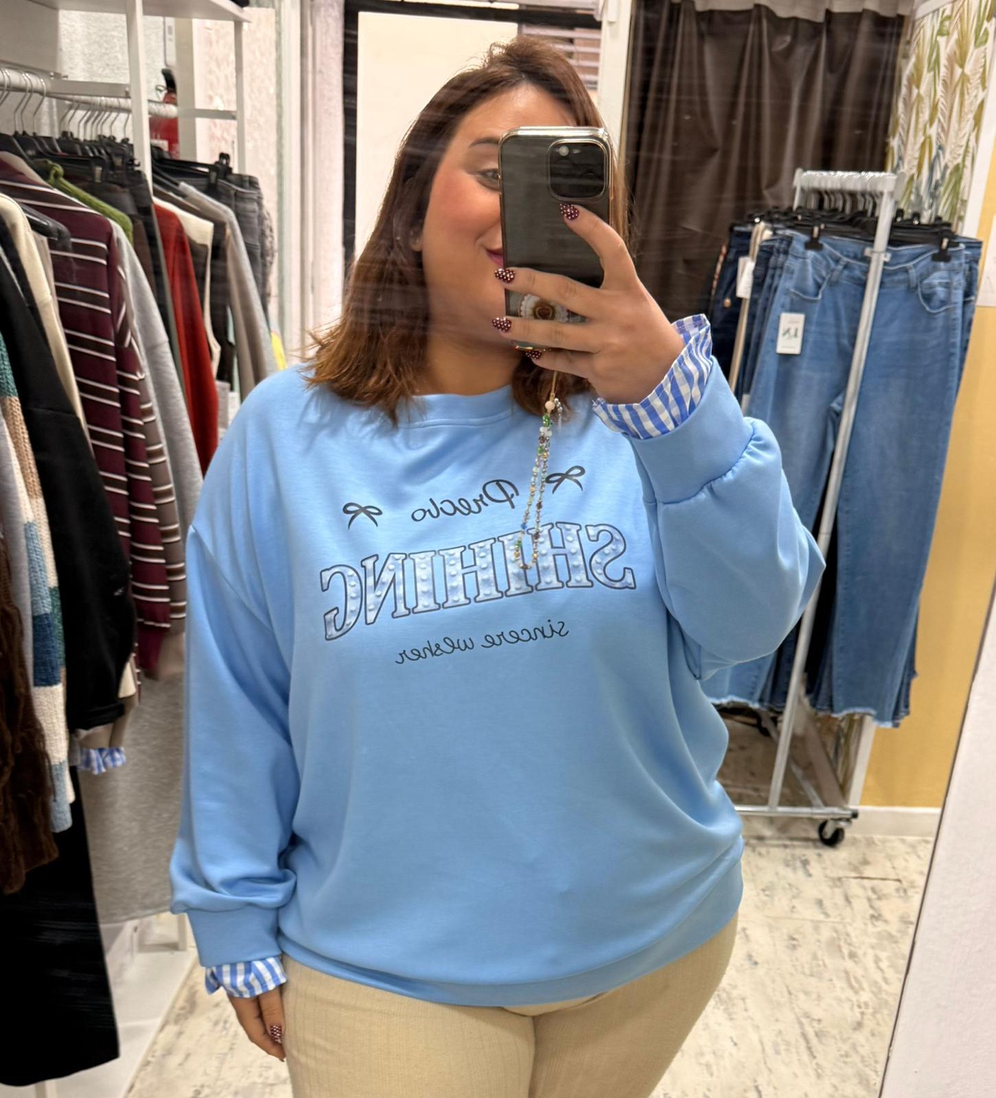 Sudadera con estampado central y el acabado de las mangas con camisa de vichi en tonos celestes.