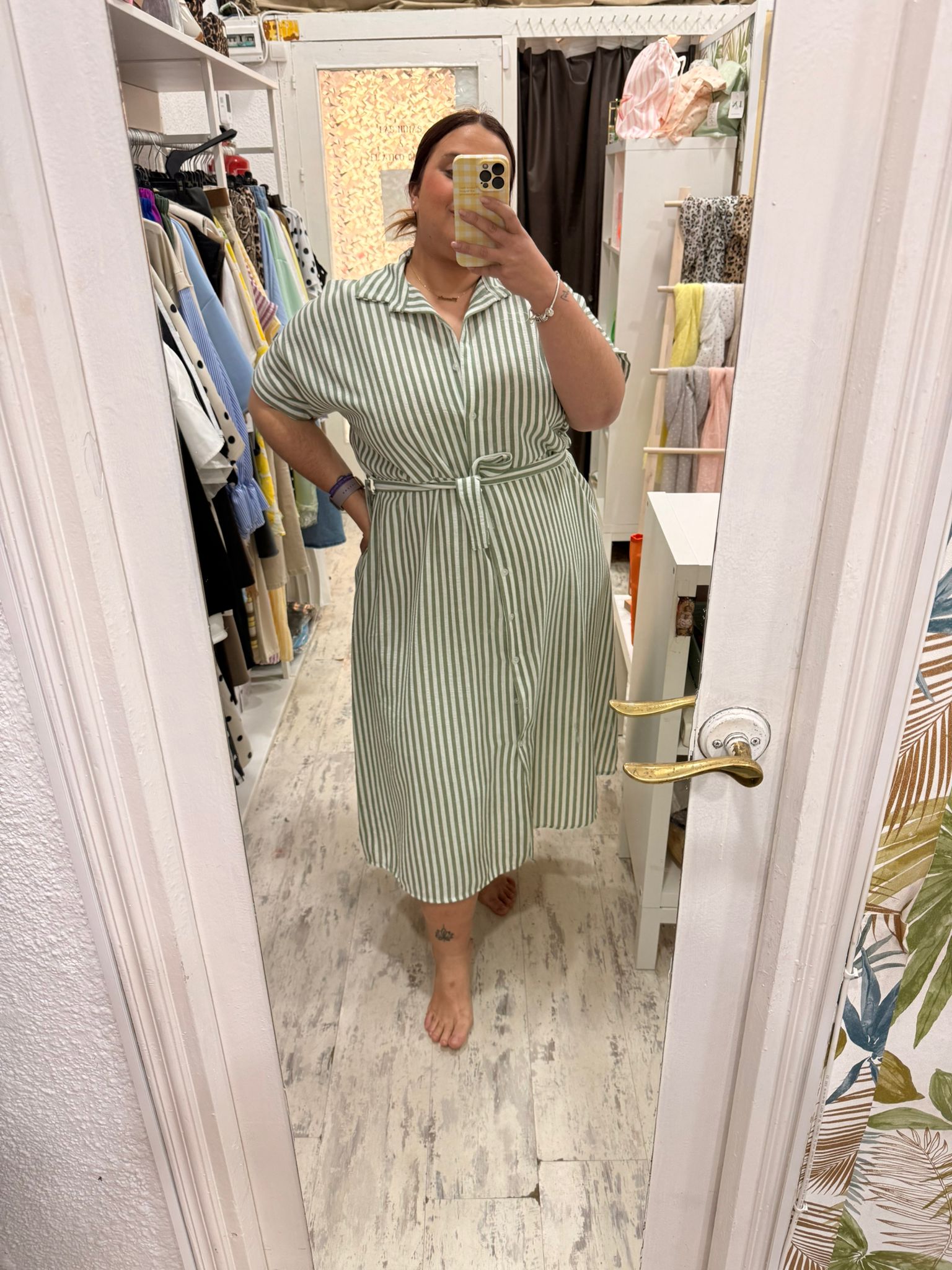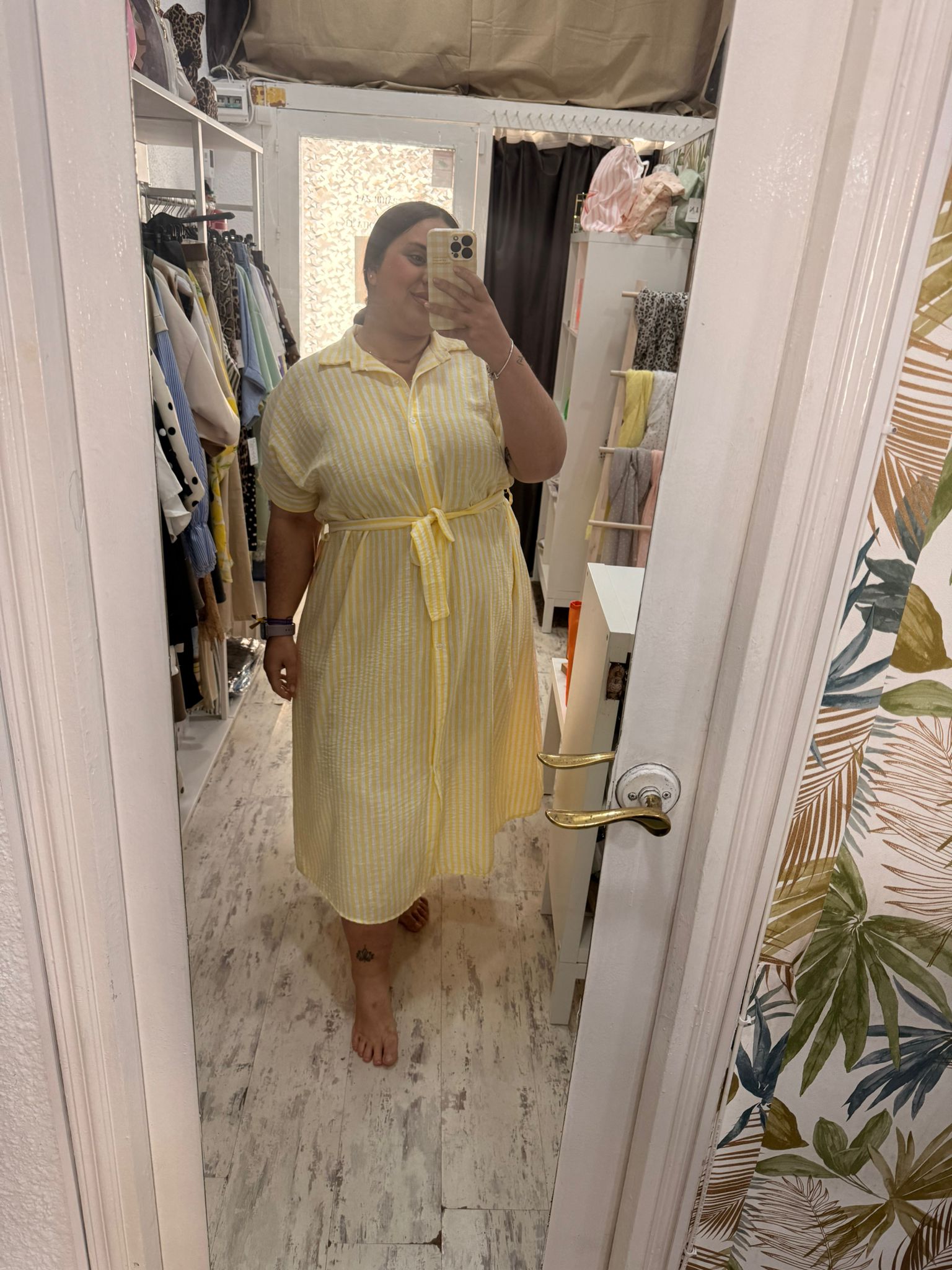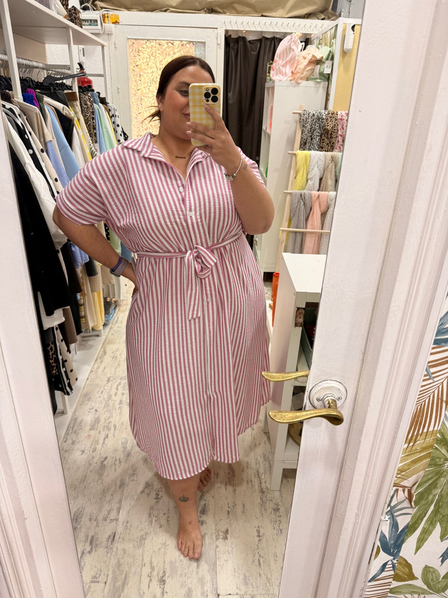 Vestido camisero sensación de tejido de lino, corte debajo del pecho y cinta para ajustarlo.