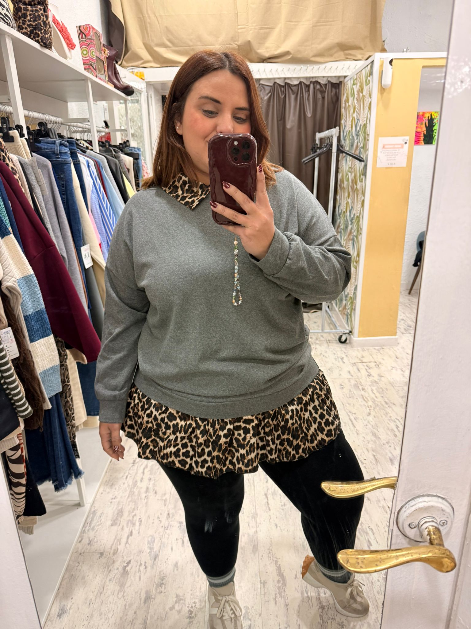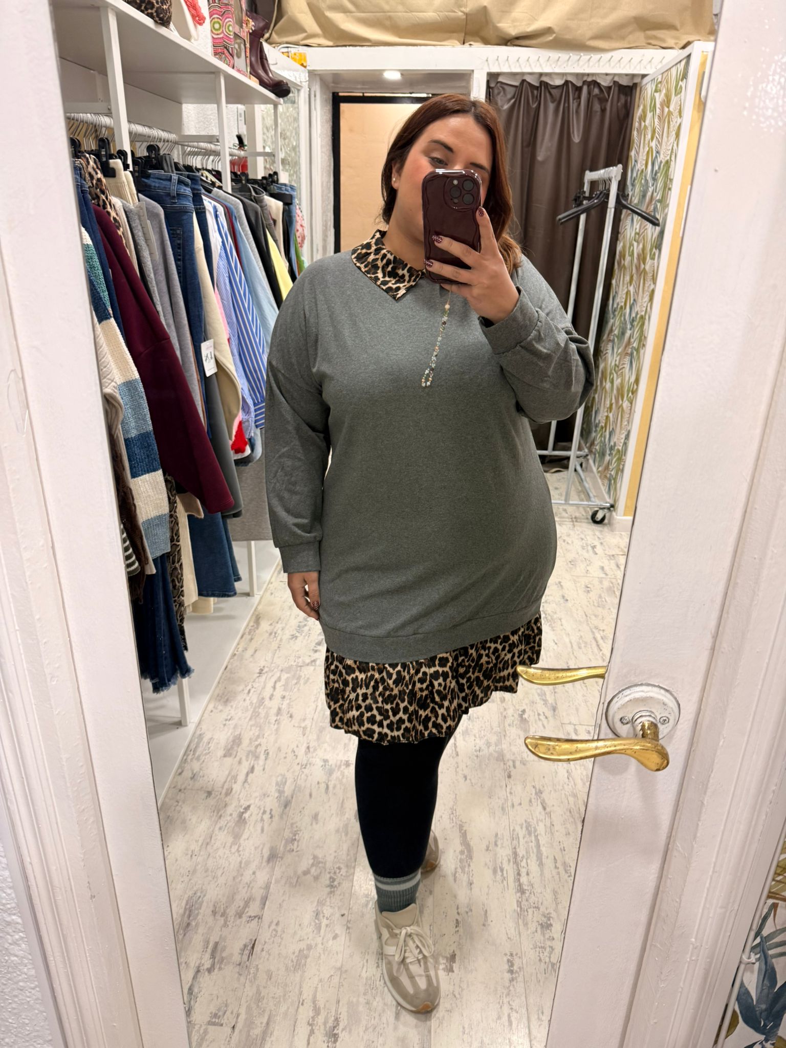 Vestido o sudadera como queráis usarlo, con cuellos y bajo de tejido de camisa en estampado de leopardo.